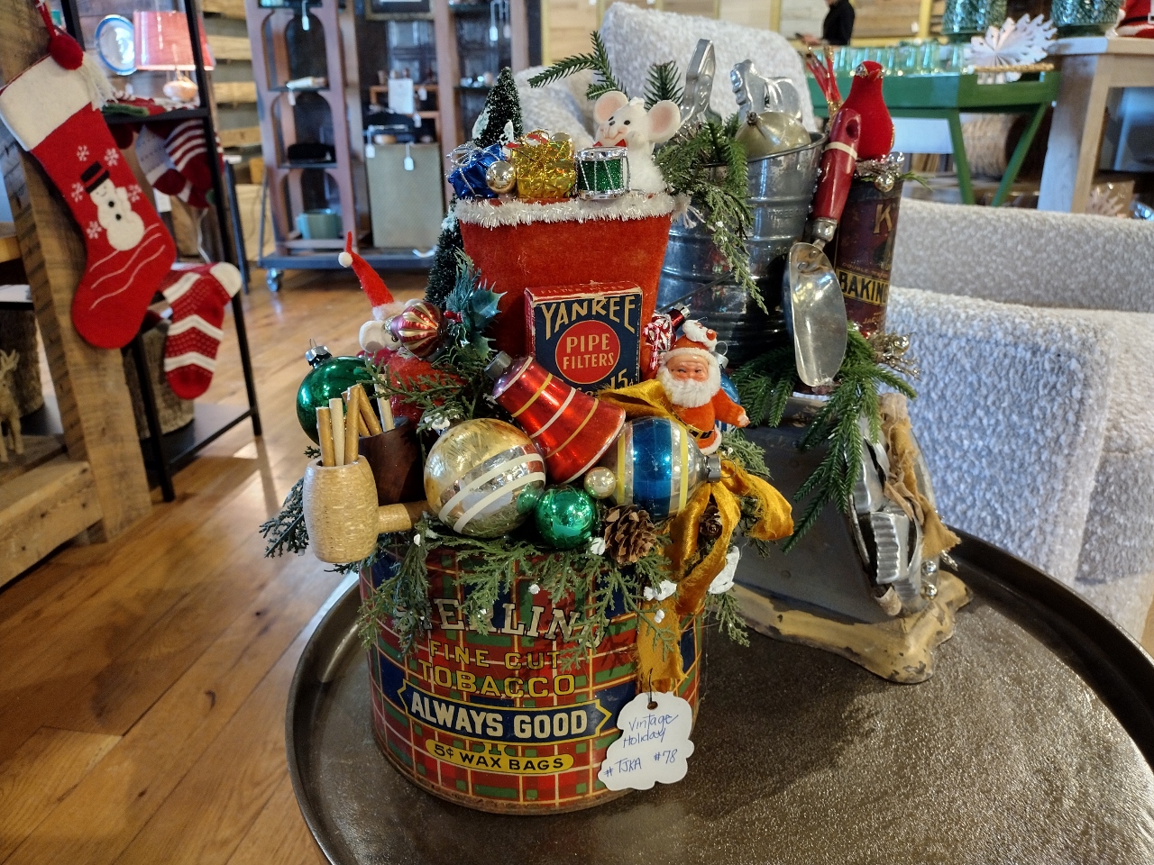In a delightfully similar way these vintage tins are being accessorized with all kinds of holiday spirit to create one of kind centerpieces. Something for the vintage lover, the nostalgia seeker, the decorator that favors that “old fashion Christmas” flair.