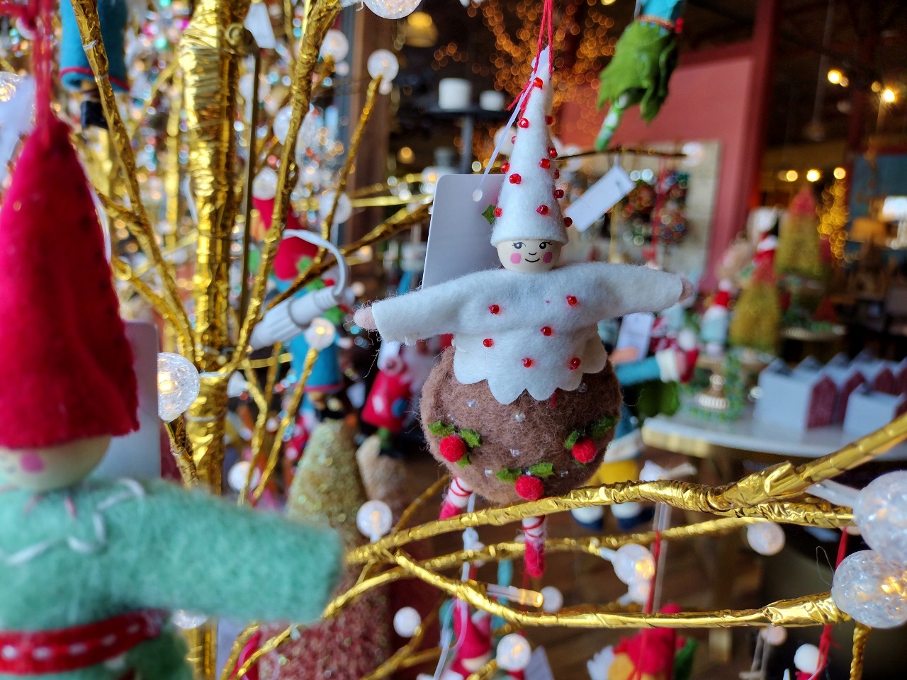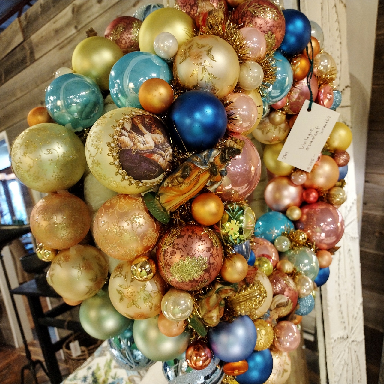 These beauties were all over the store and at first glance you might find yourself appreciating the cluster of colors and use of Christmas balls, but as you study each closer you will see there is more to them than that. You will see other vintage finds woven in.
