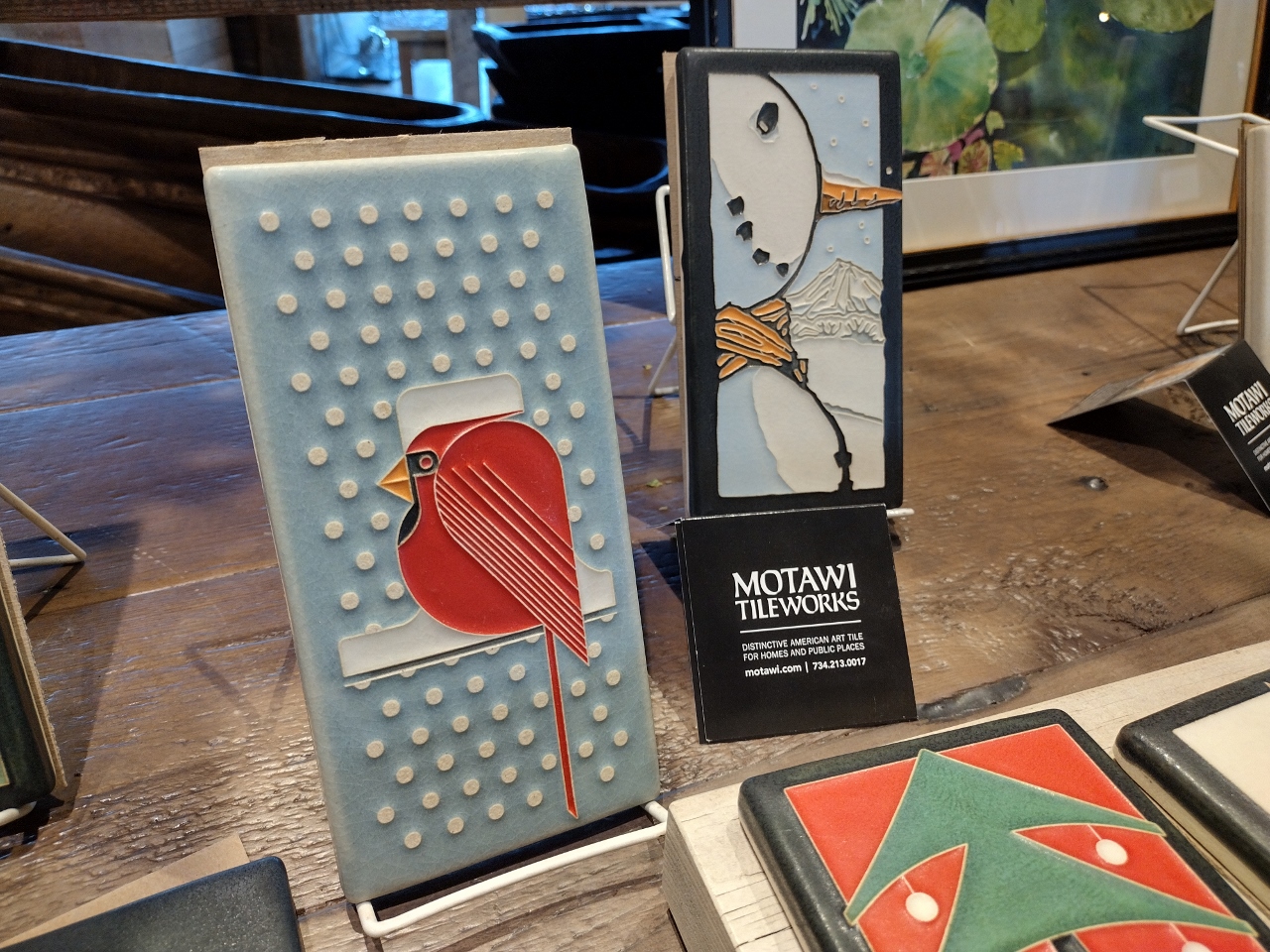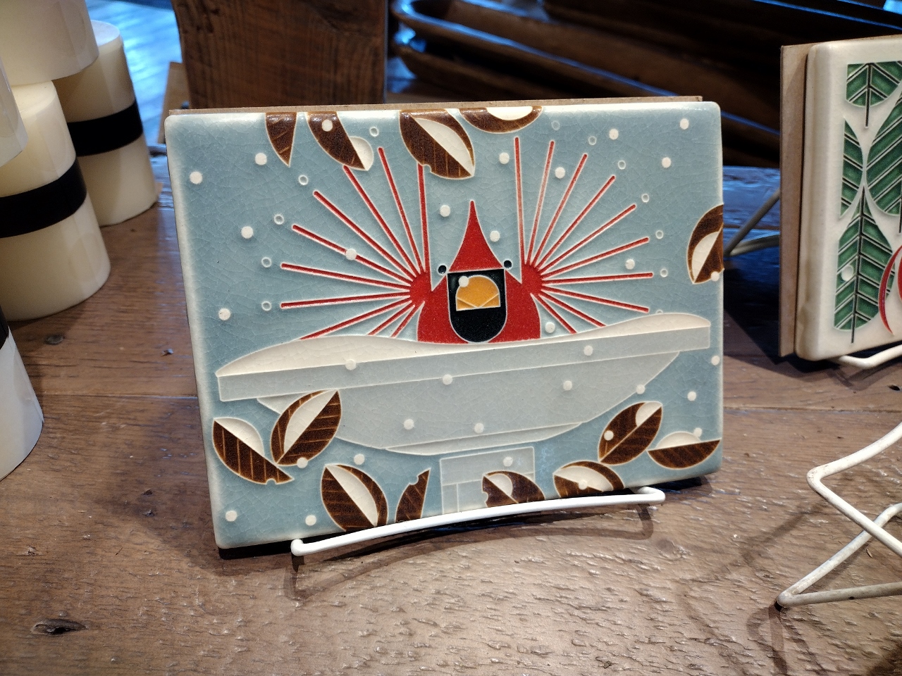 These Motawi tiles are not a seasonal installation here at Urban Evolutions. They have a prominent display near the main counter and are always a favorite of mine. The cardinal tiles would make a great gift. They are universally recognized as a bird of winter time and especially loved for their symbolism around remembering loved ones that are no longer with us for the holidays.