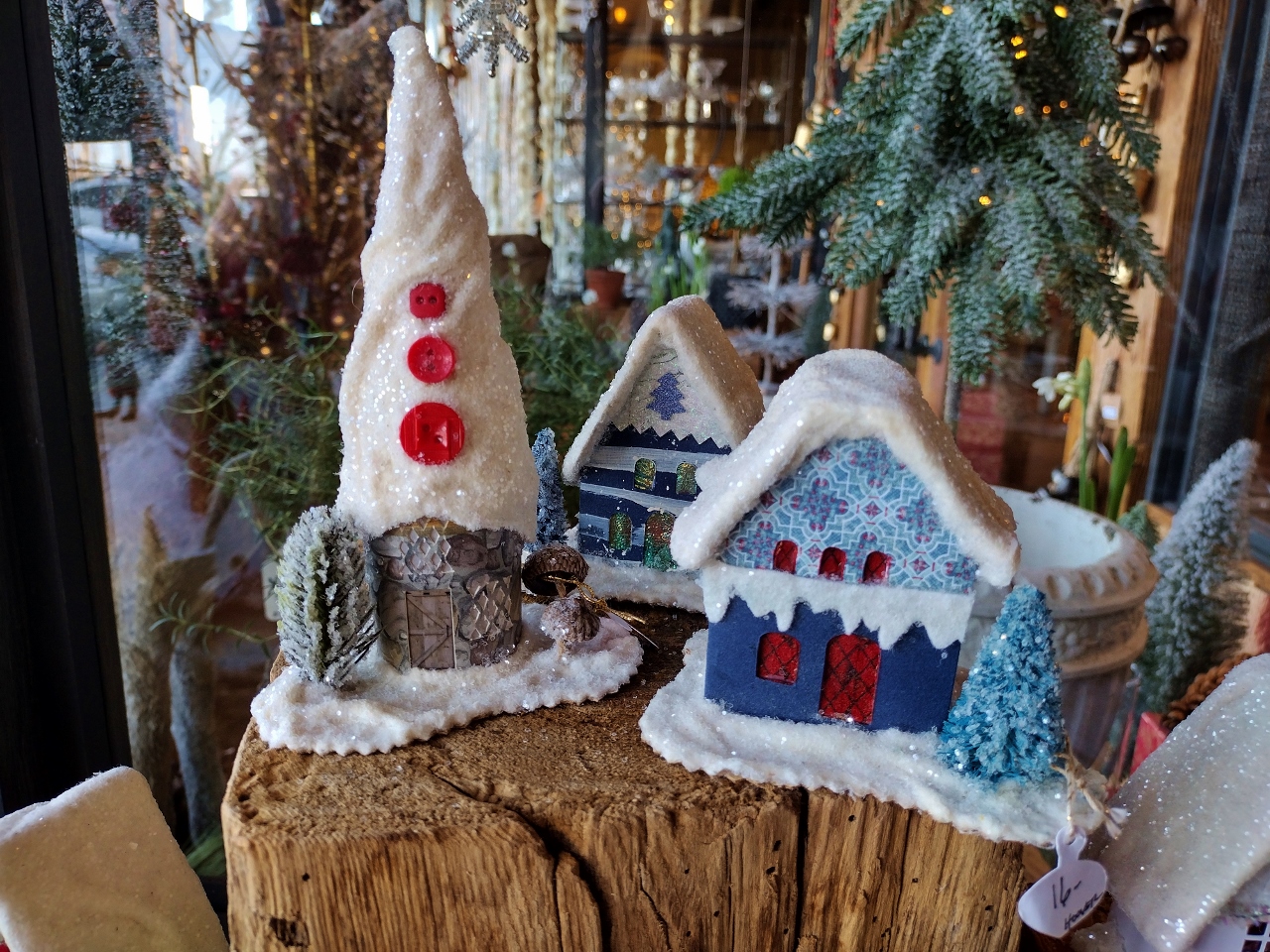 Now- I could not help myself and did buy one of these as a gift for my mom. They were all so darling that it was hard to choose between them. The backside of each has a slot that can accommodate a small Christmas light, allowing the windows and doors to light up. The miniature trees are made from acorn caps and everything is adorned in a glitter snow that makes them all the more delicate and whimsical. A reasonably priced (and sized) side gift to add to a gift basket or a small token of appreciation for a teacher or co-worker.