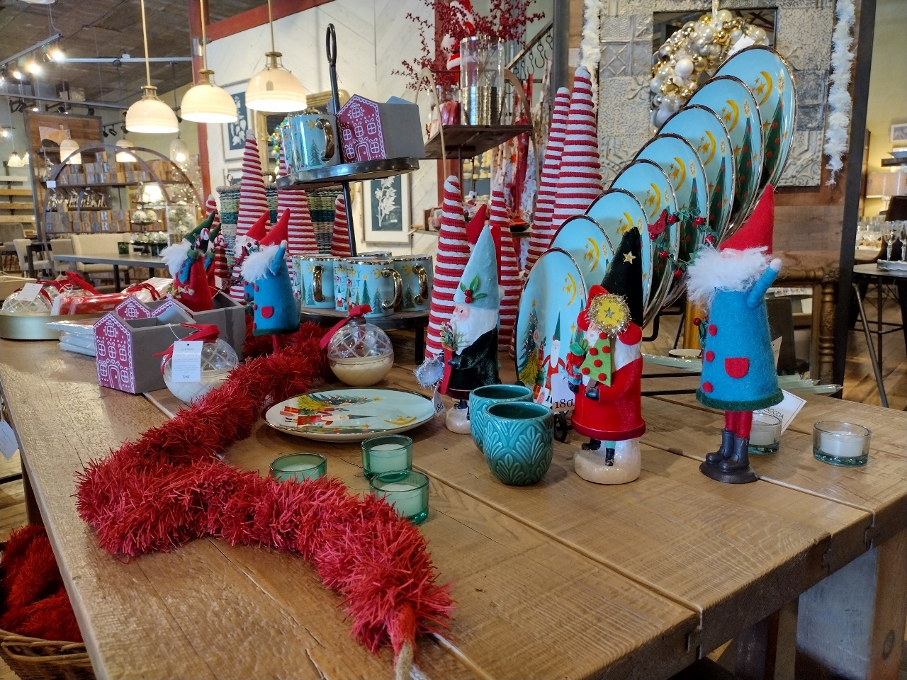 On one last bonus note-I quite enjoyed these quirky little elves in bright cheery colors, the adorable blue mugs with gold handles and the red and white cones striped like candy cane Christmas trees on this table.